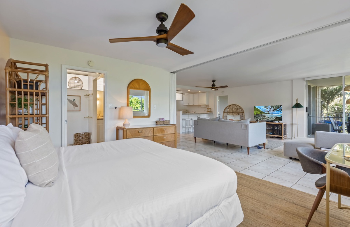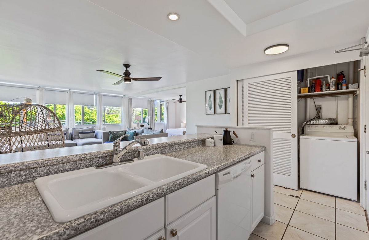 Cocina totalmente equipada, aire acondicionado y ventiladores, lavadora y secadora en la unidad.